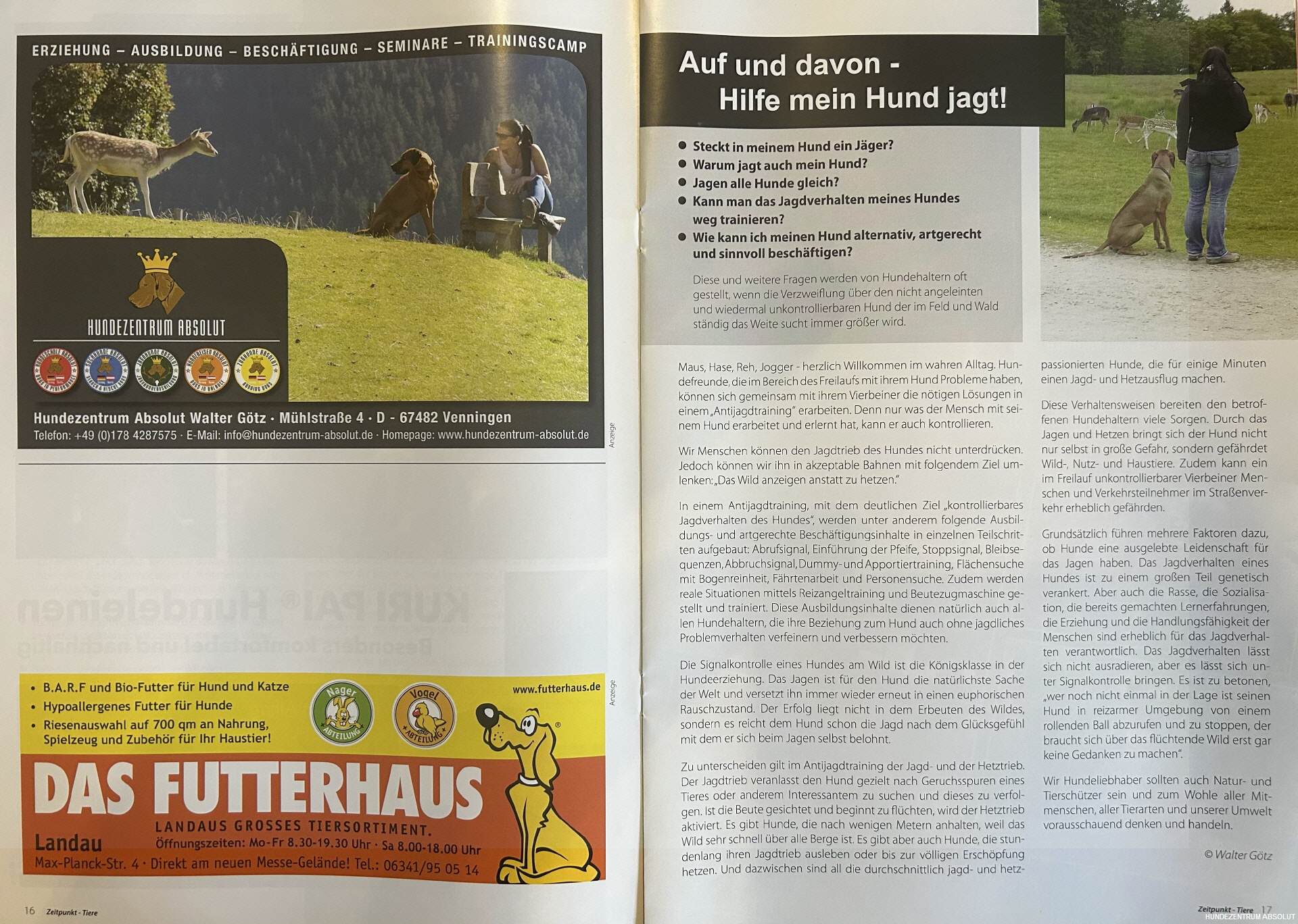 Die Verhaltensweisen von jagenden und hetzenden Hunde bereiten uns Menschen in der Regel viele Sorgen. Durch das Jagen und Hetzen bringt sich der Hund nicht nur selbst in große Gefahr, sondern gefährdet vorallem meist das Wild, zudem Pferde, Katzen, Artgenossen, Menschen oder den Straßenverkehr. Wir Hundeliebhaber sollten auch Natur- und Tierschützer sein und zum Wohle aller Mitmenschen, aller Tierarten und unserer Umwelt vorausschauend denken und handeln. Verantwortungsbewusste und sachkundige Hundeführer wissen wo, wann und ob sie ihren Hund ableinen dürfen und können, sie nehmen frühzeitig oder lassen ihren Hund an die/der Leine. Vorausschauende Hundeführer durchlaufen mit ihren Hunden in der Erziehungs- und Ausbildungsphase ein professionelles auf ein jagdhundausbildungsbasiertes Antijagdtraining (oder besser und richtig definiert: Training zur Signalkontrolle am Wild und allen weiteren Bewegungsreizen). Ein professionelles und erfolgreiches Antijagdtraining basiert ausschliesslich auf jahrelanger und erfolgreicher mit modernen hinterlegten Lerntheorien der Jagdhundeausbildung und benötigt als Trainer einen Jagdhundeausbilder mit sehr grossem Erfahrungsschatz. In der Hundeerziehung und -ausbildung ist es sicherlich für die meisten Mensch-Hunde-Teams die Königsklasse: "Die Signalkontrolle am Wild!" Wir Menschen können den Jagdtrieb des Hundes nicht unterdrücken. Jedoch können wir ihn in akzeptable Bahnen mit folgendem Ziel umlenken: "Das Wild anzeigen anstatt zu hetzen!"